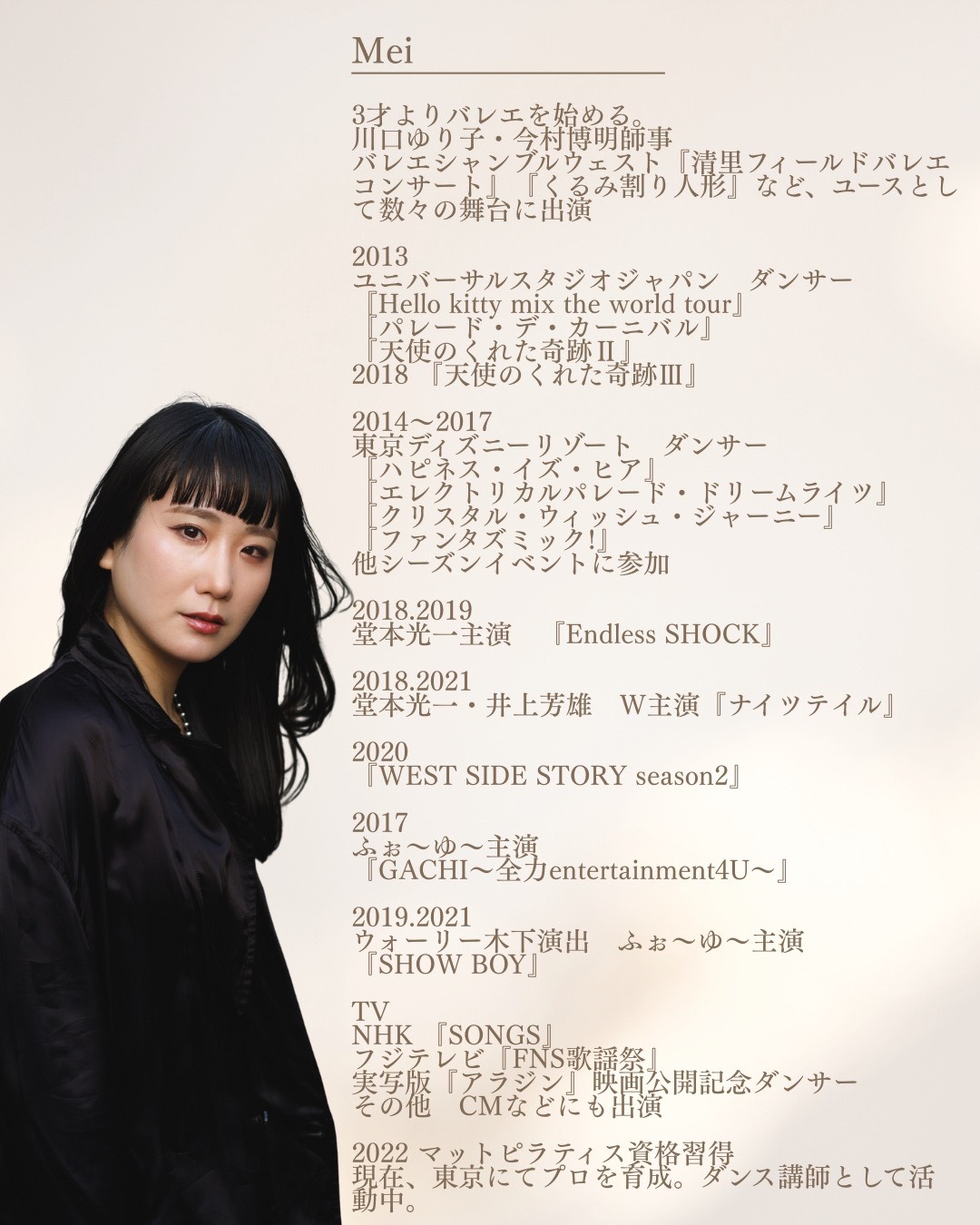 青山学院大学経済学部卒。ニューヨークに渡り語学・ダンス修行を経て、帰国後ダンサーとしてのキャリアをスタート。